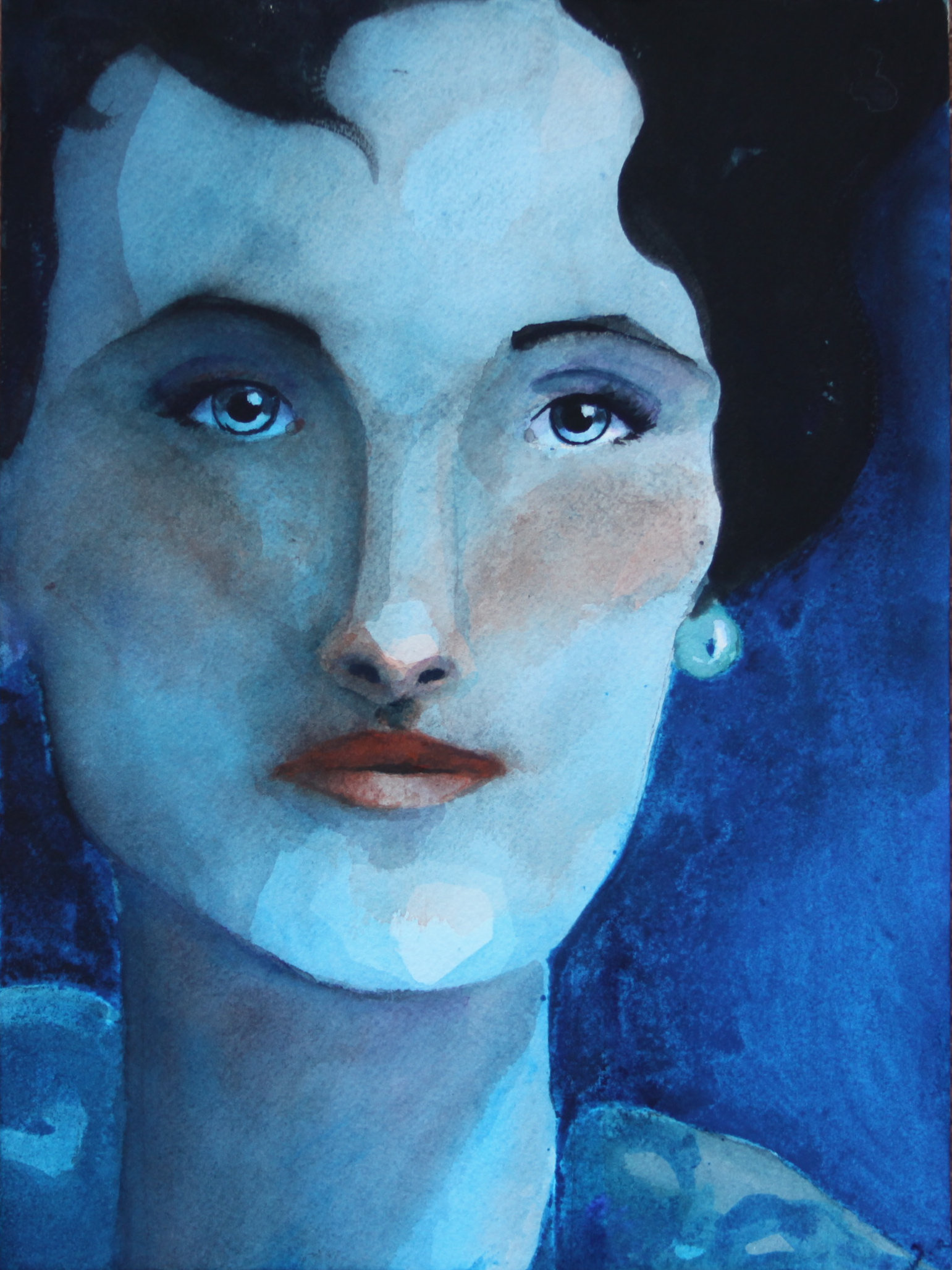 I was going through one of my black art portfolios where I keep some of my watercolors, when I came across the beginnings of this painting. I'm not sure how long ago or why I put it in my portfolio to begin with, unless I thought someday I would finish it. Well, that day was today. I could have left the painting as it was, without a background, but as I looked at this image, I couldn't help but be fascinated more and more by the image of this woman and felt she needed more. I began to paint the background in blue, and as I continued working on the painting, my application of paint became darker and darker until the resulting painting. It was quite unexpected, this painting, but there it was in my art portfolio waiting to be completed. It was quite out of the blue how I ran into it.